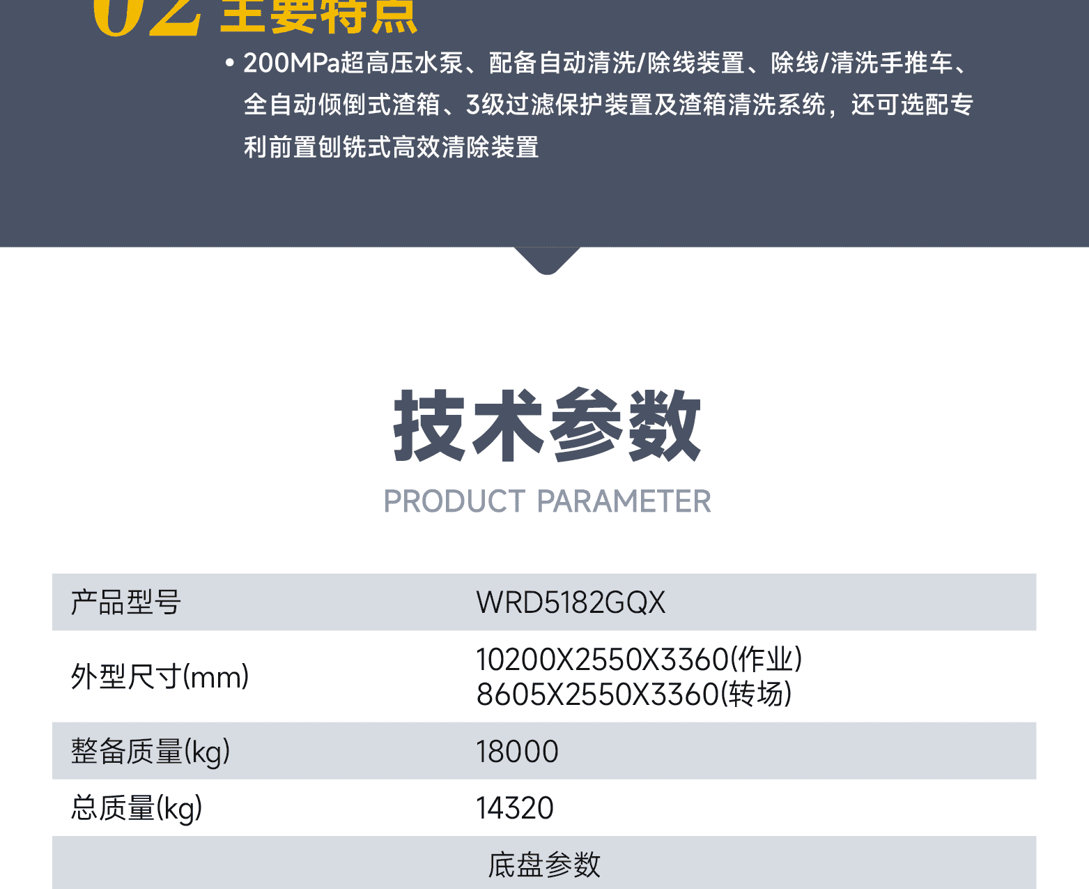 主要特點:200MPa超高壓水泵、配備自動清洗/除線裝置、除線/清洗手推車、全自動傾倒式渣箱、3級過濾保護裝置及渣箱清洗系統(tǒng)