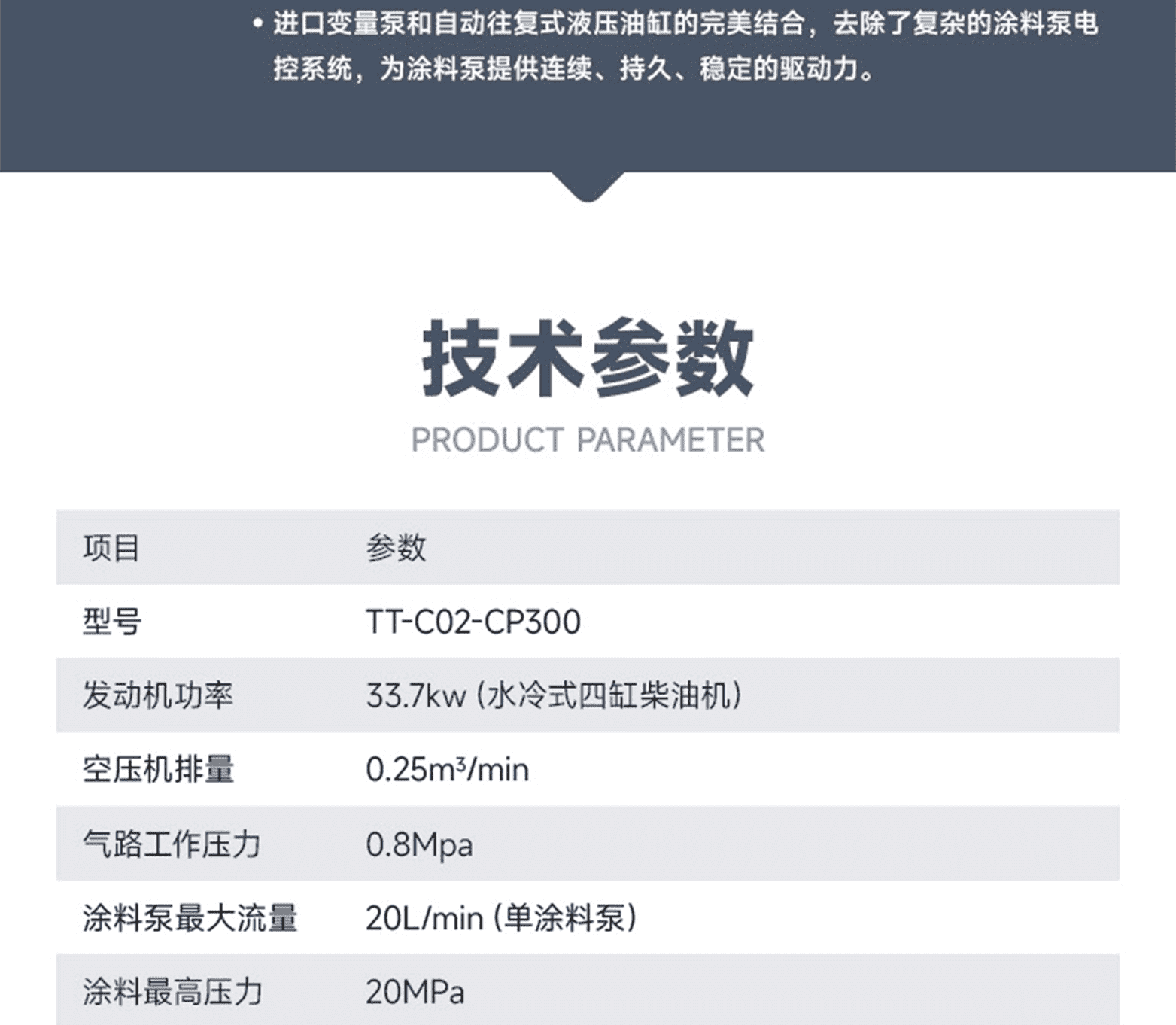 ?專家測評:液壓驅(qū)動、智能控制、涂料存輸及高壓無氣噴涂系統(tǒng)(CPAL)等;雙配單泵流量為 20L/min的進(jìn)口品牌超耐磨柱塞泵,流量大、壓力穩(wěn),噴涂壓力可在 0-25Mpa范圍內(nèi)依需調(diào)整;進(jìn)口變量泵和自動往復(fù)式液壓油缸的完美結(jié)合,去除了復(fù)雜的涂料泵電控系統(tǒng),為涂料泵提供連續(xù)、持久、穩(wěn)定的驅(qū)動力。