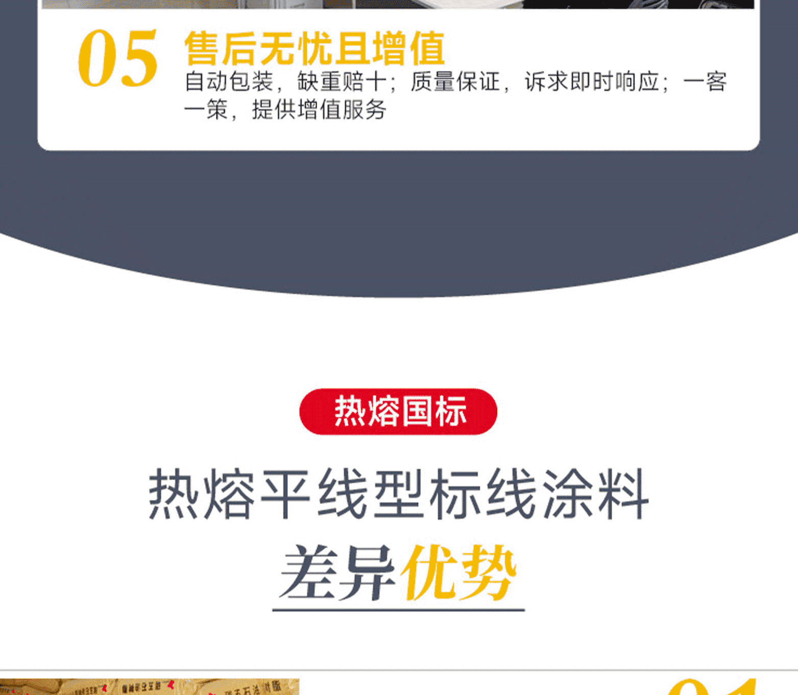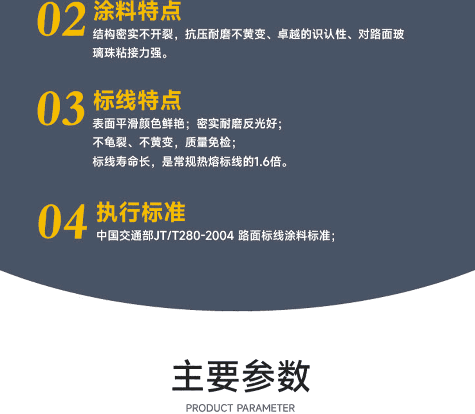 涂料特點:結構密實不開裂,抗壓耐磨不黃變、卓越的識認性、對路面玻璃珠粘接力強。標線特點:表面平滑顏色鮮艷;密實耐磨反光好;不龜裂、不黃變,質量免檢;標線壽命長,是常規熱熔標線的1.6倍。