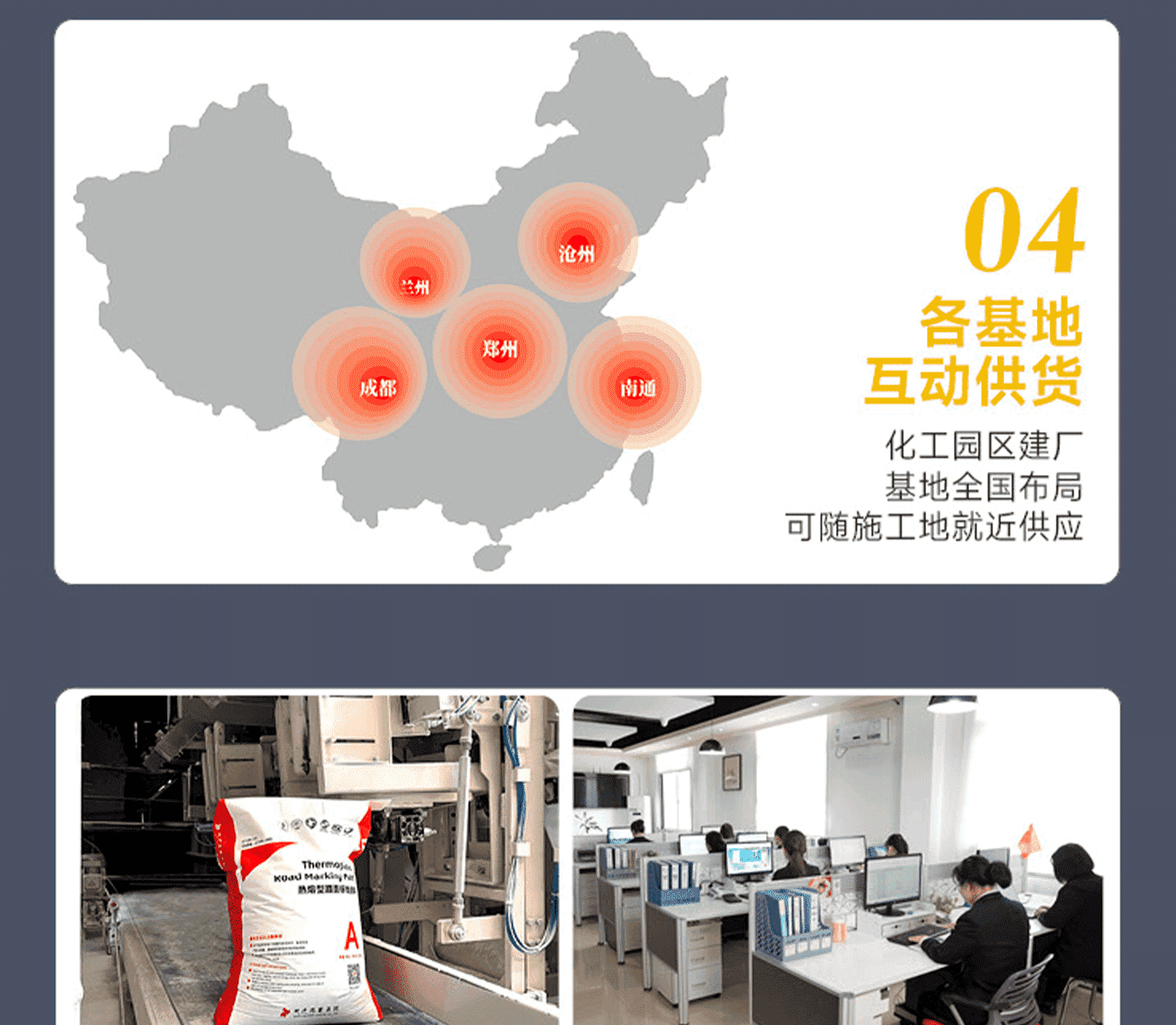 涂料特點:結構密實不開裂,抗壓耐磨不黃變、卓越的識認性、對路面玻璃珠粘接力強。標線特點:表面平滑顏色鮮艷;密實耐磨反光好;不龜裂、不黃變,質量免檢;標線壽命長,是常規熱熔標線的1.6倍。