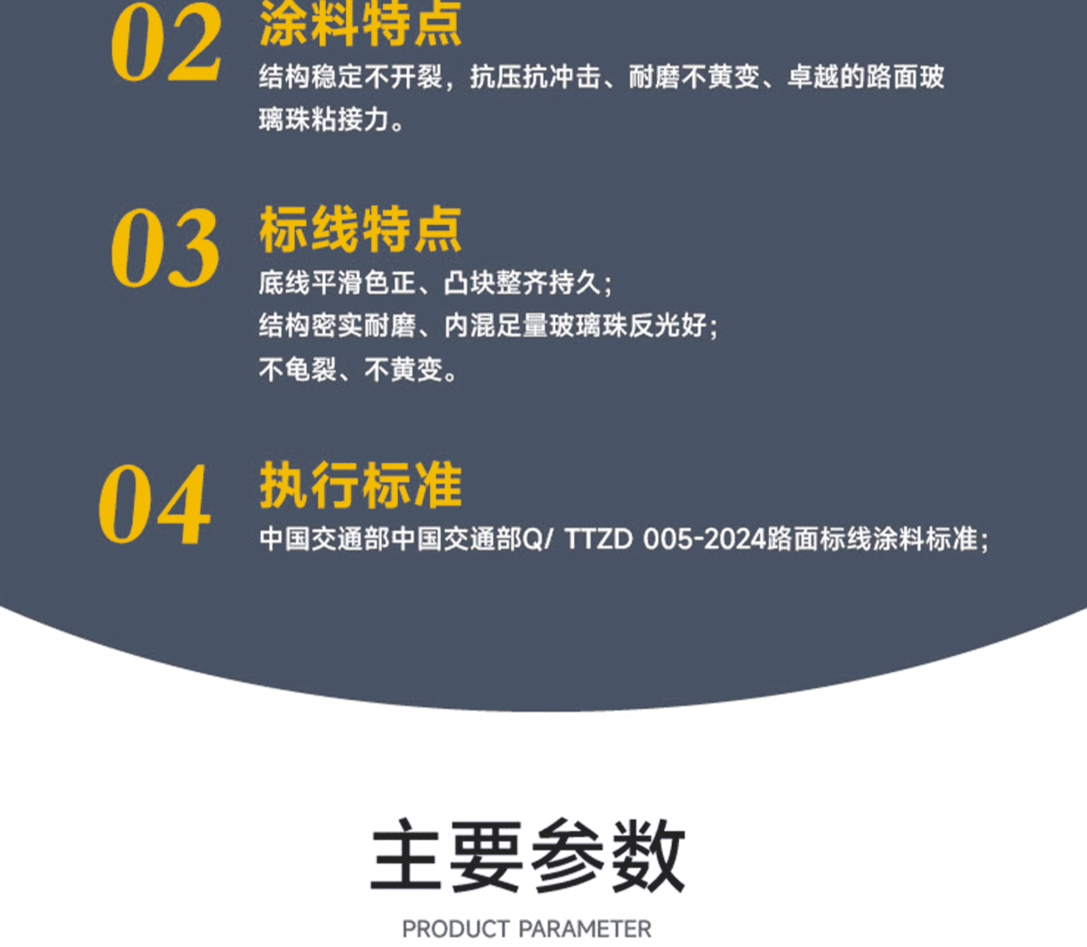 涂料特點:結構合理、混合均勻、質量一致性高 / 玻璃珠含量少 / 用途廣泛,使用方便。標線特點:表面平滑顏色鮮艷;密實耐磨反光好;不龜裂、不黃變,質量免檢;
